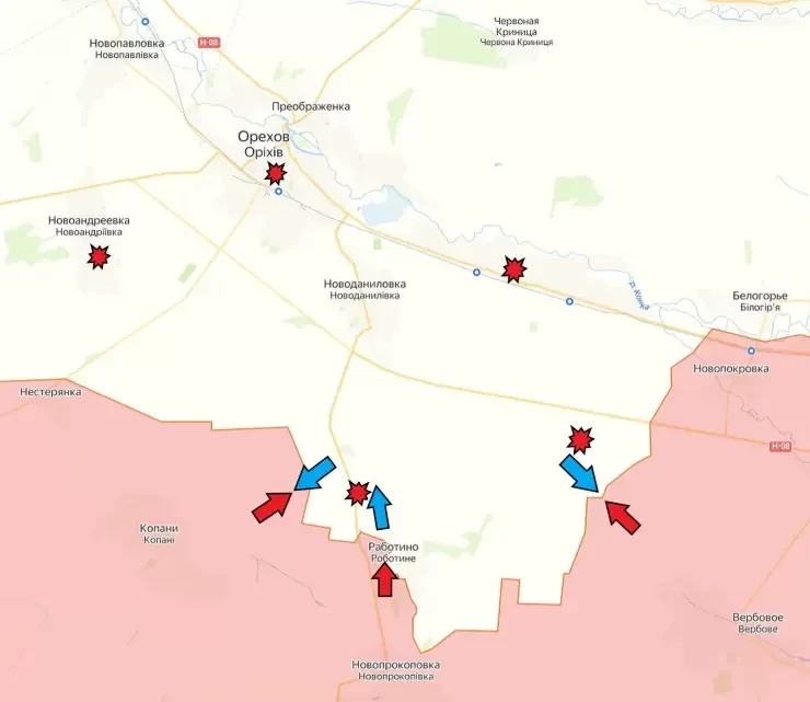 На Запорожском участке по данным информагентств наши военные подняли флаг России над селом Работино. Флаг - это отлично, хотя подняли его давно и у нашей позиции, а не вражеской. И похоже, позитивный доклад наверх опередил реальные события. И теперь наши усердно «догоняют» - ВС РФ продвигаются, но говорить об освобождении Работино рано.