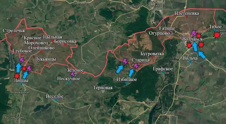 На восточном участке происходят боестолкновения в районе Старицы. Также ожесточённые бои идут в северной части Волчанска - в районе Волчанского агрегатного завода и в руинах городской застройки чуть восточнее и северо-восточнее завода. За последние сутки каких-то существенных изменений не зафиксировано.
