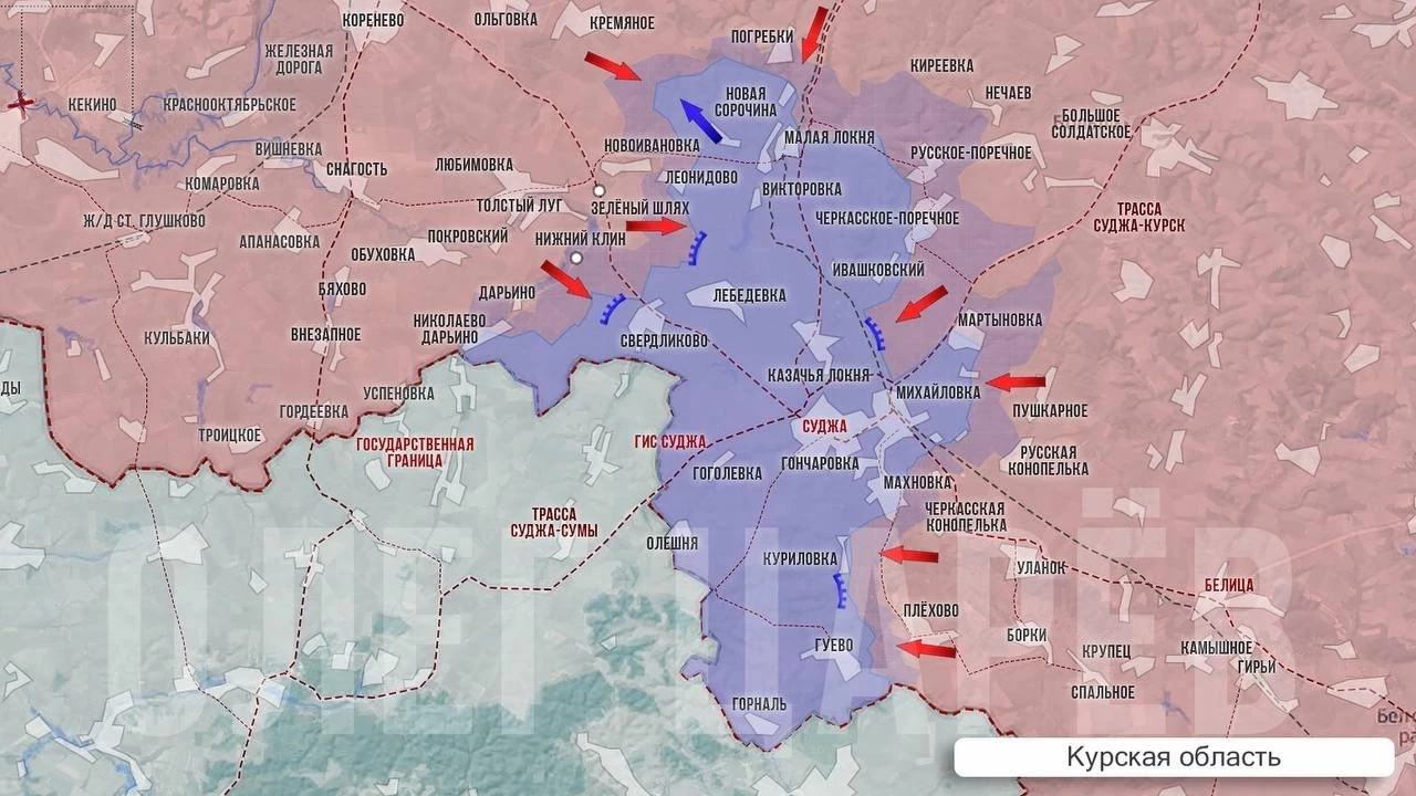 Южнее Суджи после освобождения Плехово российские войска не стали штурмовать в лоб укрепления у Куриловки, а двигаются в обход Гуево, по лесным массивам у границы. Похоже, что в этом движении они затронули часть территории Сумской области. Информацию об этом опубликовал украинский мониторинговый канал, и это вызвало переполох на украинских ресурсах. Согласно опубликованной карте, ВС РФ заняли территорию около двух квадратных километров возле приграничного села Александрия в Сумской области. С Украины одни заявляют, что граница на замке, и «их там нет», другие утверждают, что там болото и делать там нечего.