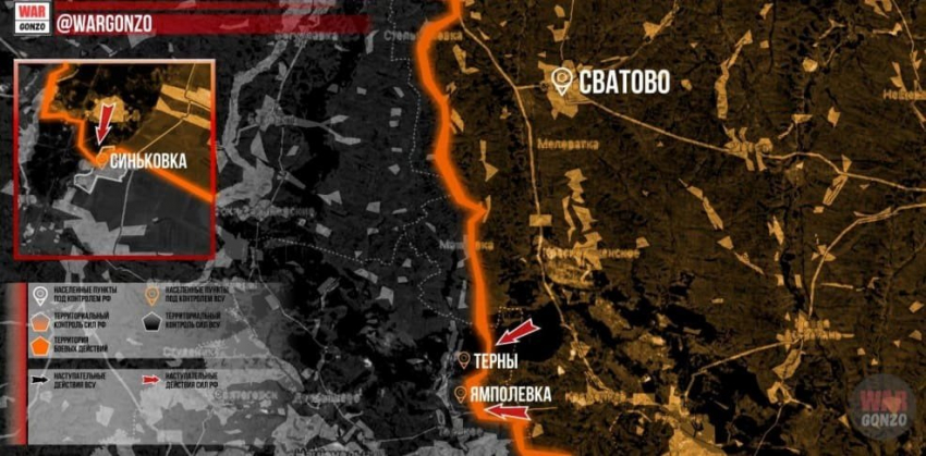 На Луганском фронте российские войска, при поддержке артиллерии, продолжают штурмовые действия у Ямполевки и Тернов и Синьковки. Линия боевого соприкосновения остаётся без изменений.