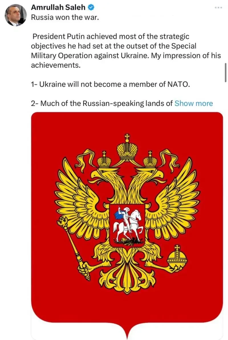 Бывший исполняющий обязанности президента Афганистана Амрулла Салех, он же экс-вице-президент и экс-глава МВД Афганистана, опубликовал в социальной сети пост, который проиллюстрировал государственным гербом Российской Федерации.