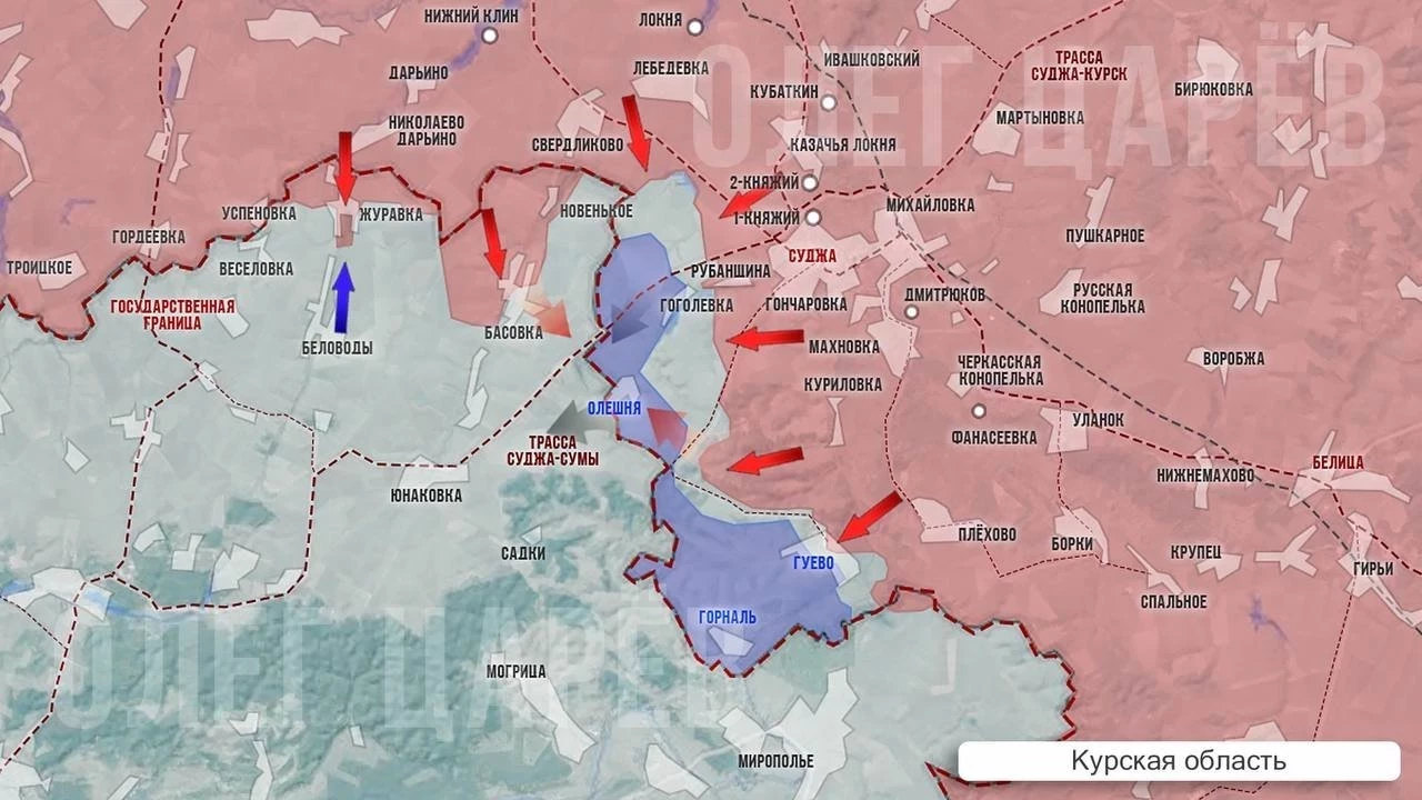 Вооружённые силы Российской Федерации (ВС РФ) ведут ожесточённые бои в районе четырёх сёл у границы: Гоголевки, Олешни, Гуево и хутора Горналь. При этом сообщают, что большая часть Гоголевки и Гуева уже под российским контролем, а также о том, что наши части зашли в Горналь. Однако о полном освобождении сёл говорить до полной зачистки рано, к тому же противник постоянно подбрасывает новые резервы и активно контратакует. На высоте у Гуево наши разведчики уже водрузили российский флаг. Для этого они специально зашли в тыл врага с необходимым оборудованием.