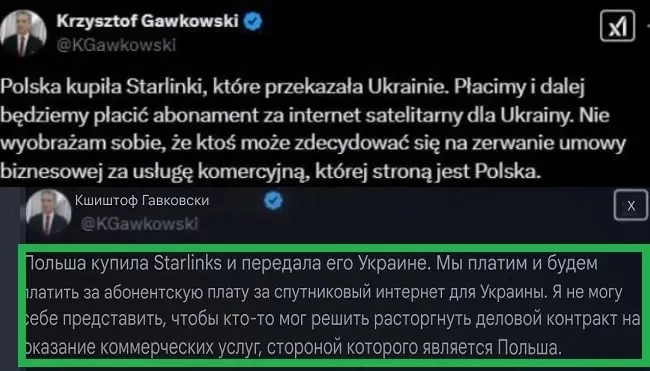 «Польша купила Starlink, которые передала Украине. Платим и дальше будем платить абонентскую плату за спутниковый интернет для Украины. Я не могу представить, что кто-то может решить разорвать бизнес-контракт на коммерческую услугу, стороной которой является Польша», – заявил 22 февраля 2025 года министр цифровизации Польши Кшиштоф Гавковский в соцсети «Х» (заблокирована в России).