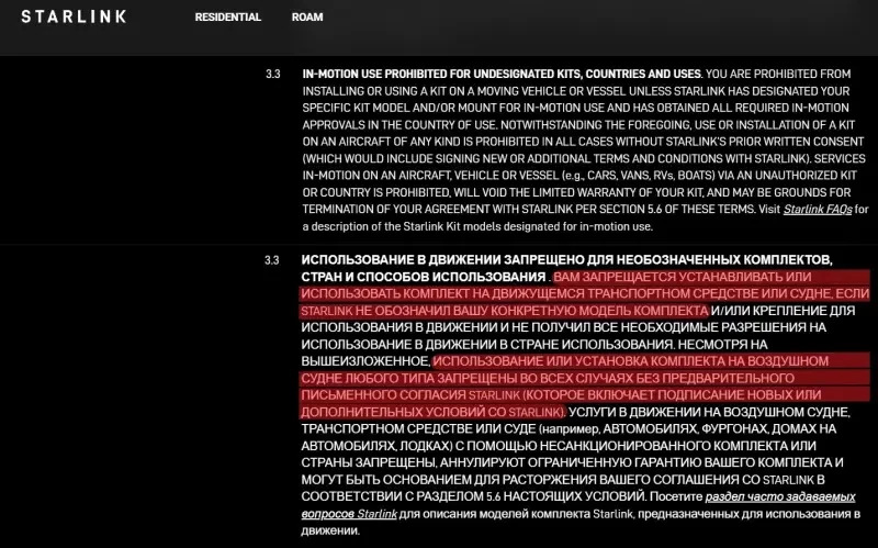 Также п. 3.3 условий обслуживания Starlink запрещает установку комплектов Starlink на любые транспортные средства, не согласованные компанией SpaceX, а также на все без исключения летательные аппараты: