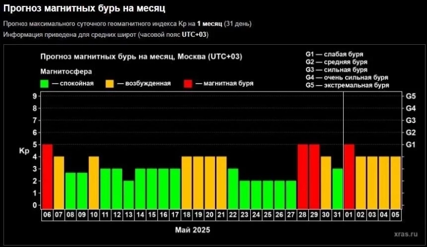 Тяжелее всего будет в конце месяца. 28-30 мая специалисты прогнозируют сильную магнитную бурю уровня G1. В эти дни советуют избегать чрезмерных физических нагрузок, ограничить потребление кофеина и соблюдать режим сна и отдыха.
