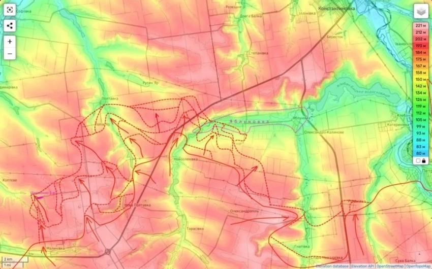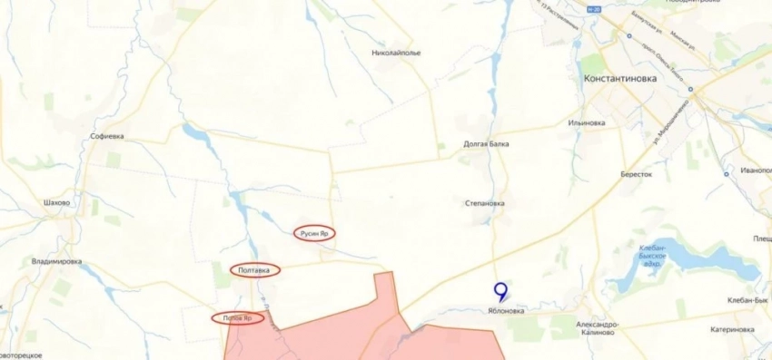Юрий Подоляка сообщает о продолжающемся охвате Константиновки с западной стороны. Украинские войска пытаются хоть как-то закрепиться на линии Попов Яр - Полтавка - Русин Яр, но пока безуспешно.