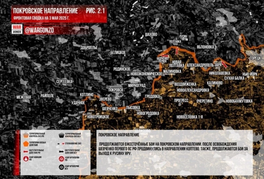 Не смолкают ожесточённые бои на Покровском направлении. После освобождения Шевченко Первого ВС РФ продвинулись в направлении Коптево. Также, продолжаются бои за выход к Русину Яру.