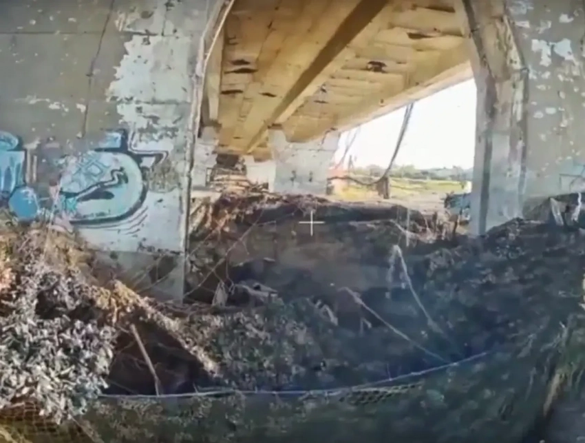 В ролике демонстрируются кадры объективного контроля с российского дрона, операторы которого обнаружили два накрытых маскировочной сеткой плавсредства под одной из уцелевших опор бывшей переправы через Днепр в Херсонской области. Что характерно, укрытие противник сделал основательное, затянув место схрона рыболовными сетями.