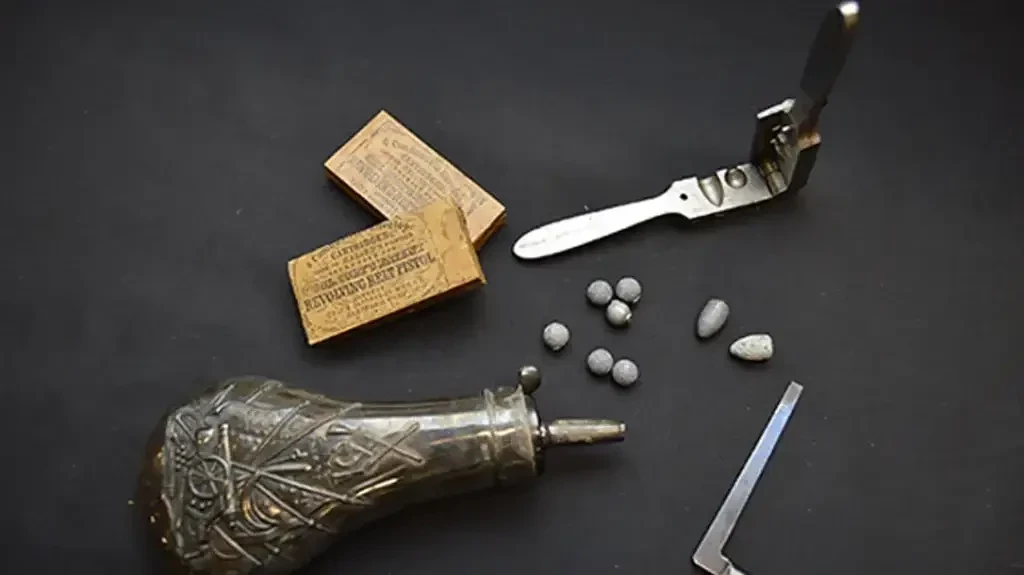 Пороховница и пулелейка. Причем с ее помощью можно было отливать как сферические пули, так и шарообразные!