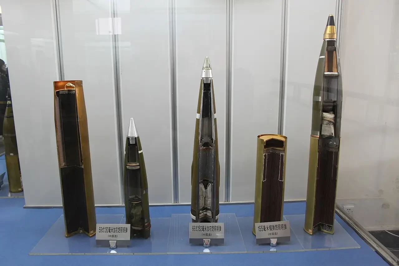 Артиллерийские выстрелы китайского производства. Крайние справа — гильза и снаряд калибра 155 мм