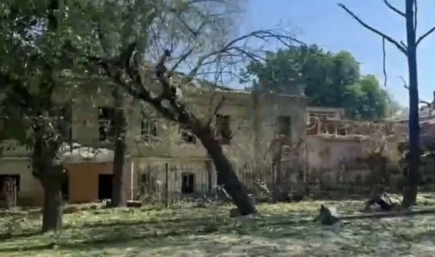 На кадрах видно получившее повреждение здание территориального центра комплектования (ТЦК-военкоматы), стоящее рядом с несколькими другими зданиями.