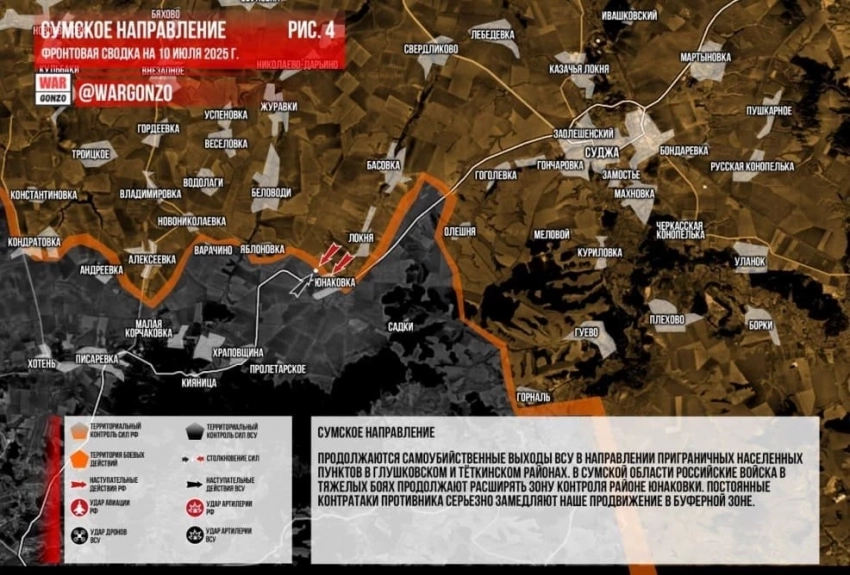 На Сумском направлении продолжаются самоубийственные выходы ВСУ в направлении приграничных населенных пунктов в Глушковском и Тёткинском районах. В Сумской области российские войска в тяжелых боях продолжают расширять зону контроля районе Юнаковки. Постоянные контратаки противника серьезно замедляют наше продвижение в буферной зоне.