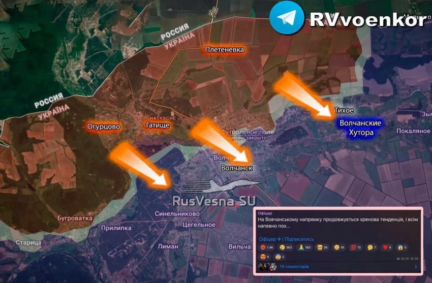 На Харьковском фронте наши продвигаются в юго-западной части Волчанска и в лесах поблизости. Противник из района Тихого отходит в Волчанские Хутора. В районе Мелового наши давят противника в лесах южнее села.