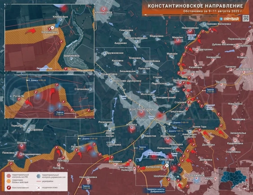 На Константиновском направлении позиционные бои в районе Полтавки и Русин Яра. Тяжёлые бои продолжаются в районе Катериновки и Клебан-Быка, большая часть этой территории в серой зоне. Александро-Шультино по большей части под нашим контролем. В районе Предтечино ВС РФ продолжают теснить ВСУ,