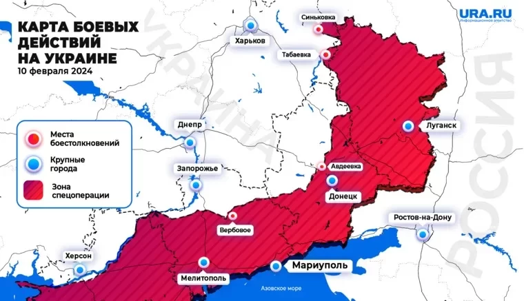 Обновлённая карта боевых действий на Украине по данным на 12:00 мск сегодня, 10 февраля 2024