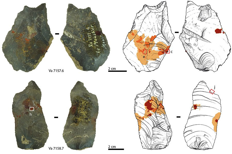 Тем не менее, это повествование не прижилось благодаря новому анализу каменных орудий возрастом 40 000 лет из культового памятника Ле Мустье во Франции, который дал свое название мустьерскому технологическому комплексу, который в значительной степени связан с неандертальцами среднего палеолита. Химический анализ цветных остатков на пяти инструментах, сделанных неандертальцами, выявил следы гетитовой охры и битума, компонента сырой нефти.