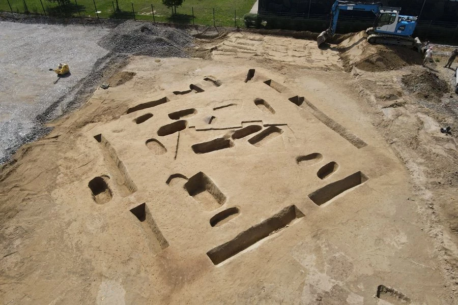 Государственное управление по сохранению памятников (LAD) наняло археологов для исследования территории промышленной зоны, которую планируется расширить. В период с апреля по июль этого года в 17 эллиптических или прямоугольных могильных ямах было найдено в общей сложности 18 захоронений. Они были сгруппированы вокруг центральной могилы, в которой находились останки двух человек. Одно из захоронений находилось сразу за периметром могильного сада; одно было вырыто в траншее по периметру.