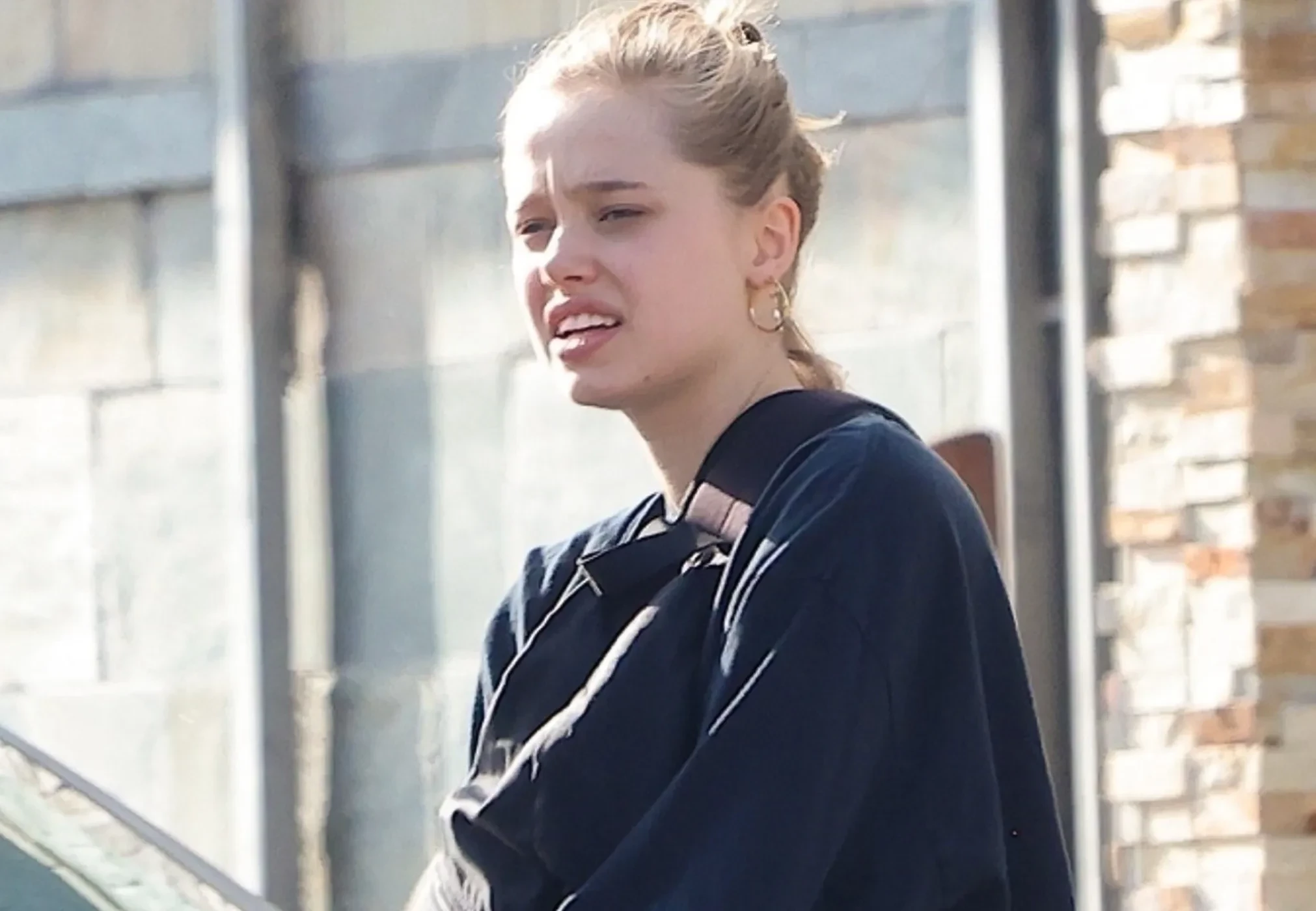 Шайло была облачена в объёмный темно-синий свитшот и широкие чёрные брюки, свои светлые волосы она убрала в высокий пучок (напомним, некоторое время Шайло носила короткую стрижку). Из аксессуаров у дочери Джоли замечены золотое кольцо на большом пальце и крупные серьги-кольца.