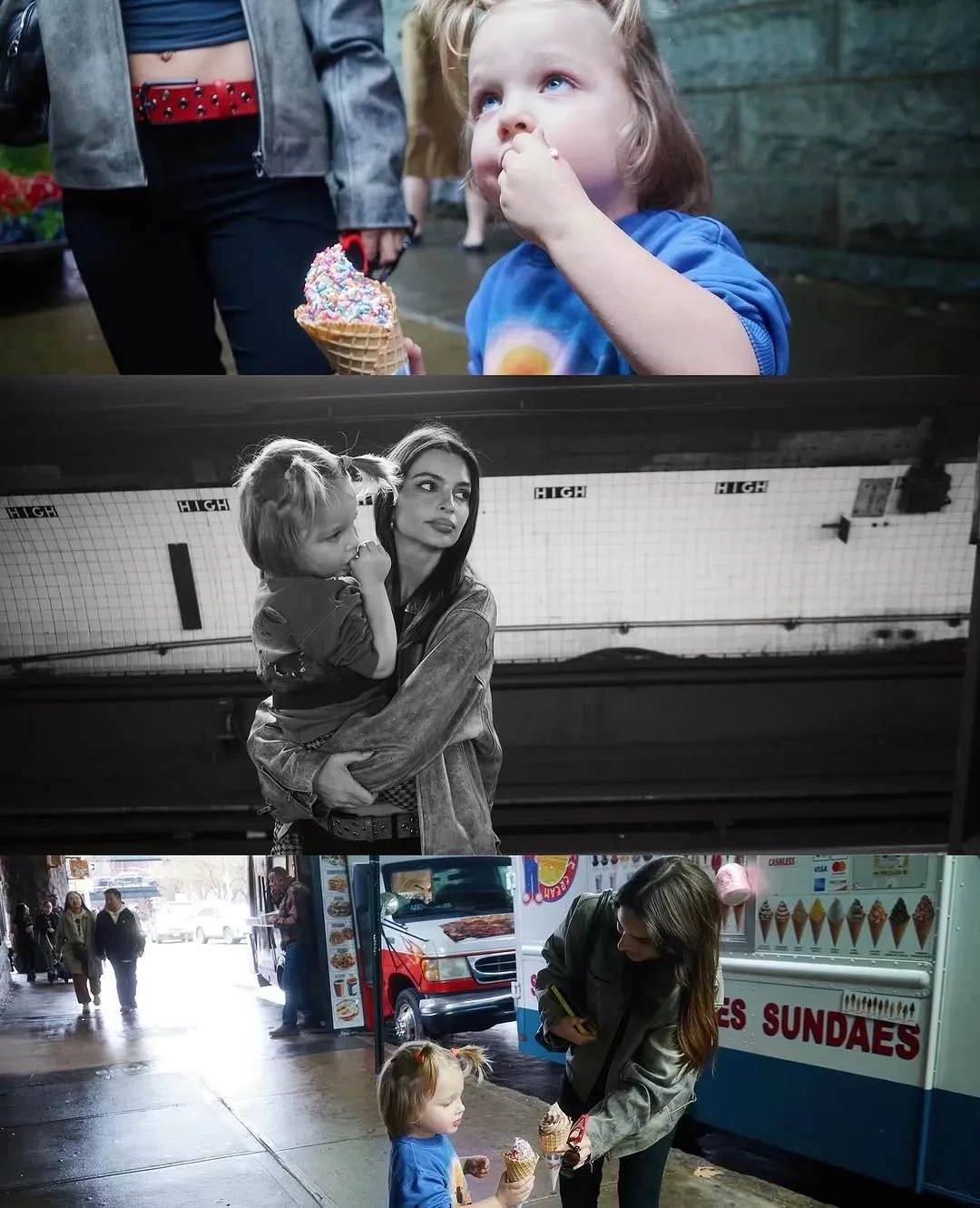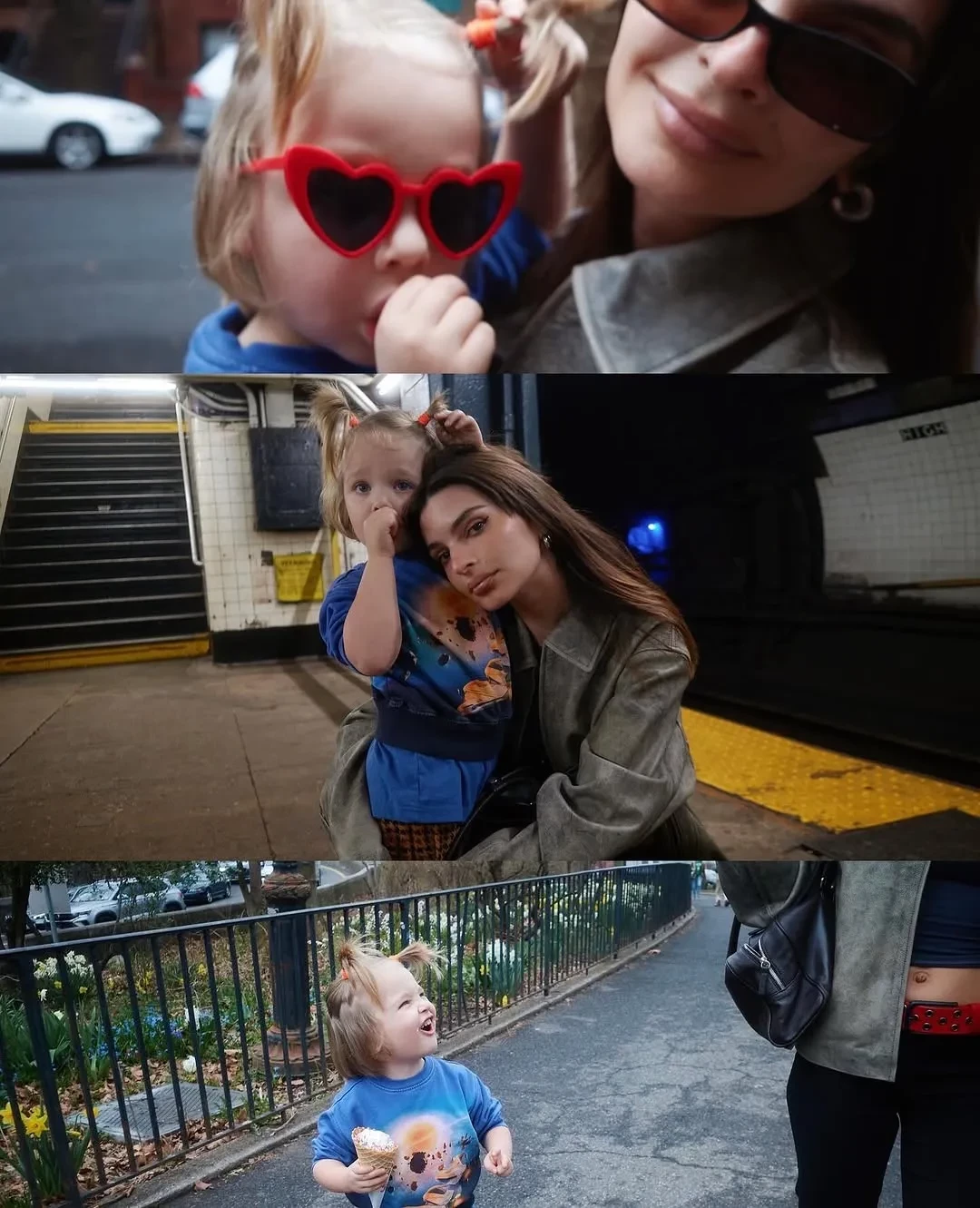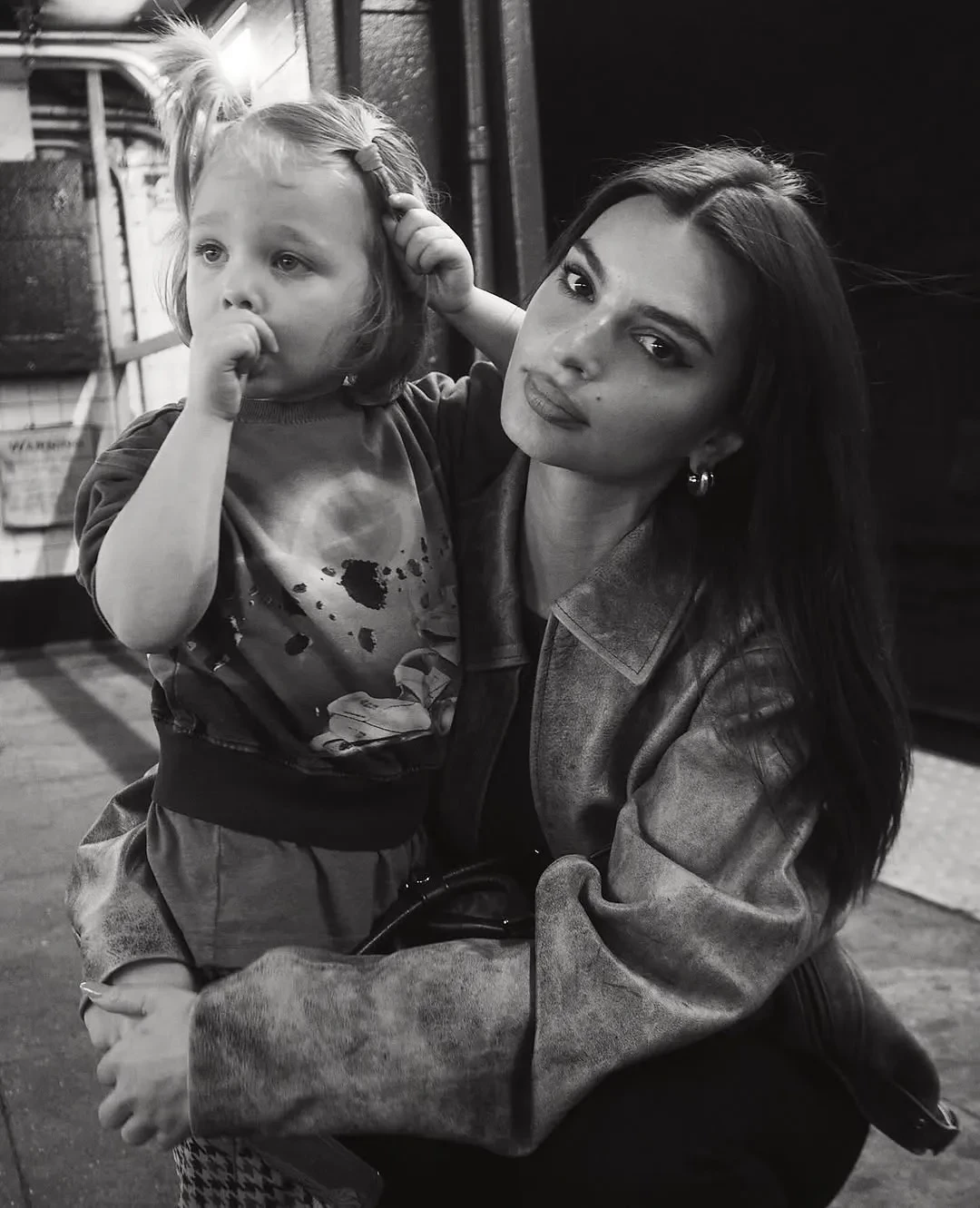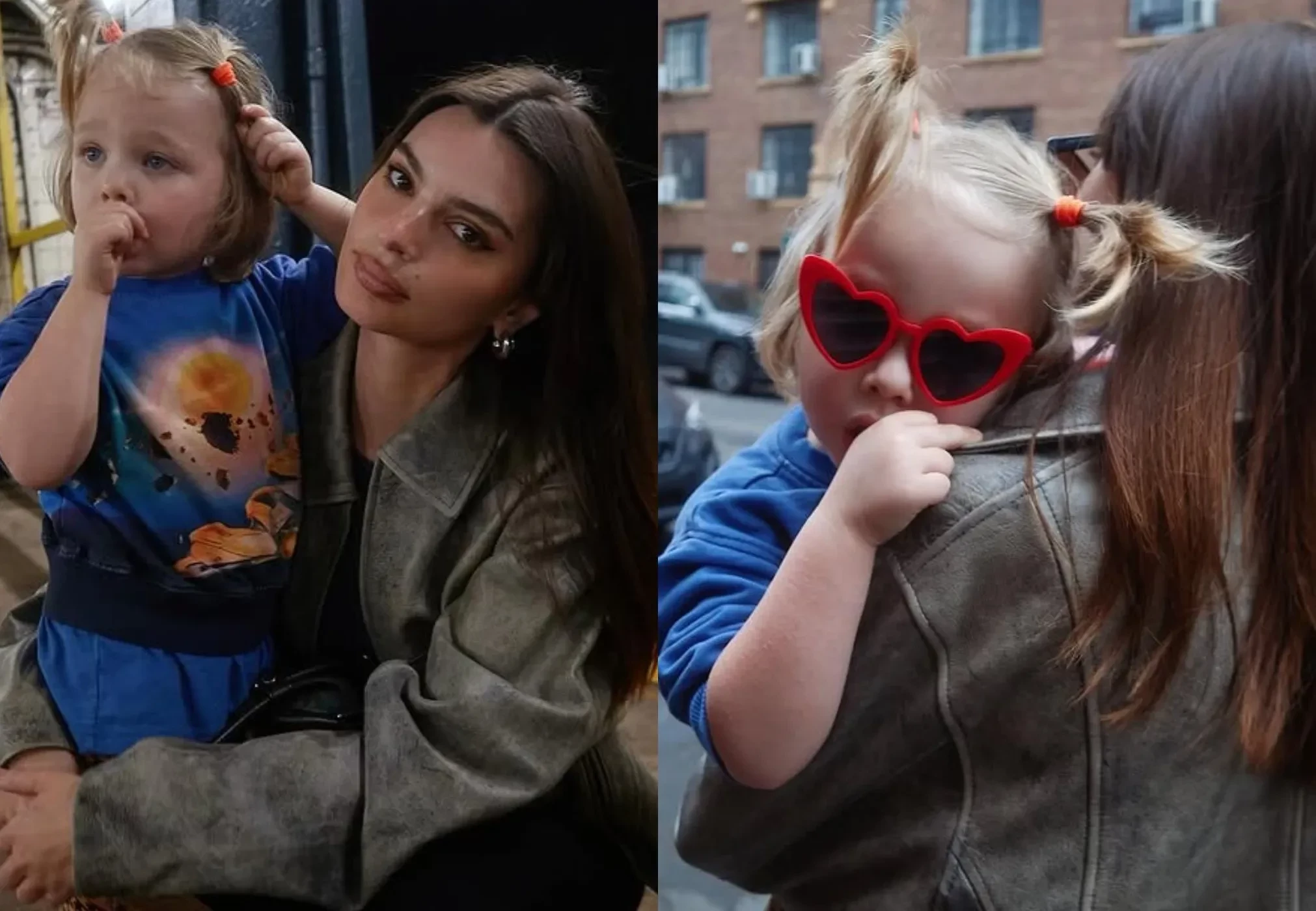 "Слай (модель называет сына Sly, что в переводе — хитрый) и его мама", — подписала кадры Эмили, на которых она позирует в кожаной куртке и чёрных брюках. Ребёнок звезды одет в свитшот космическим принтом, брюки в клетку, солнцезащитные очки в форме сердец, а его волосы заплетены в хвостики.