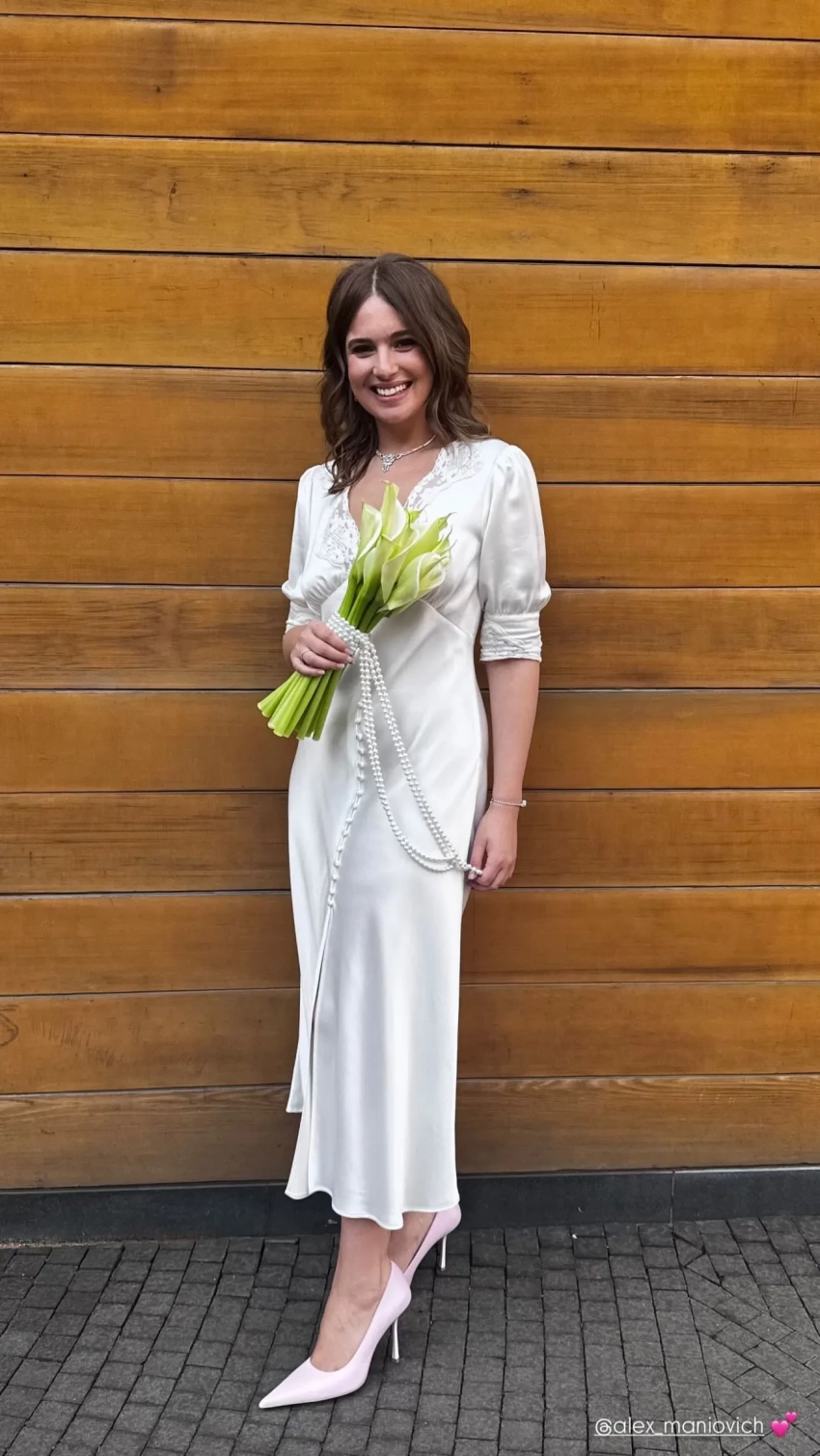Александра выбрала для церемонии белое платье с рукавом три четверти от британского бренда Rixo. Она дополнила наряд нежно-розовыми туфлями с острым носом, бриллиантовым колье и серьгами. Свадебный букет состоял из белых калл, а вместо привычной ленты были использованы жемчужные бусы.