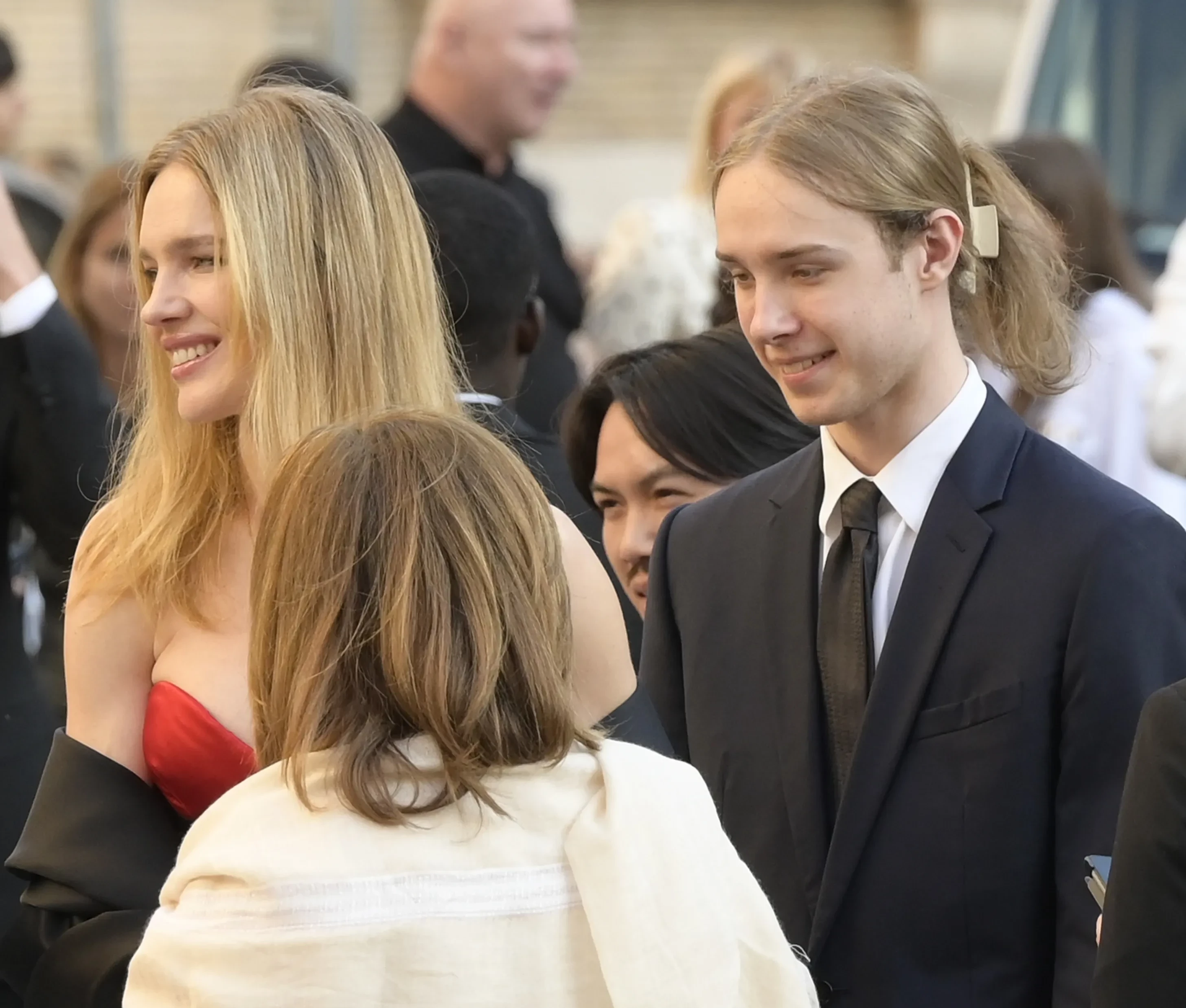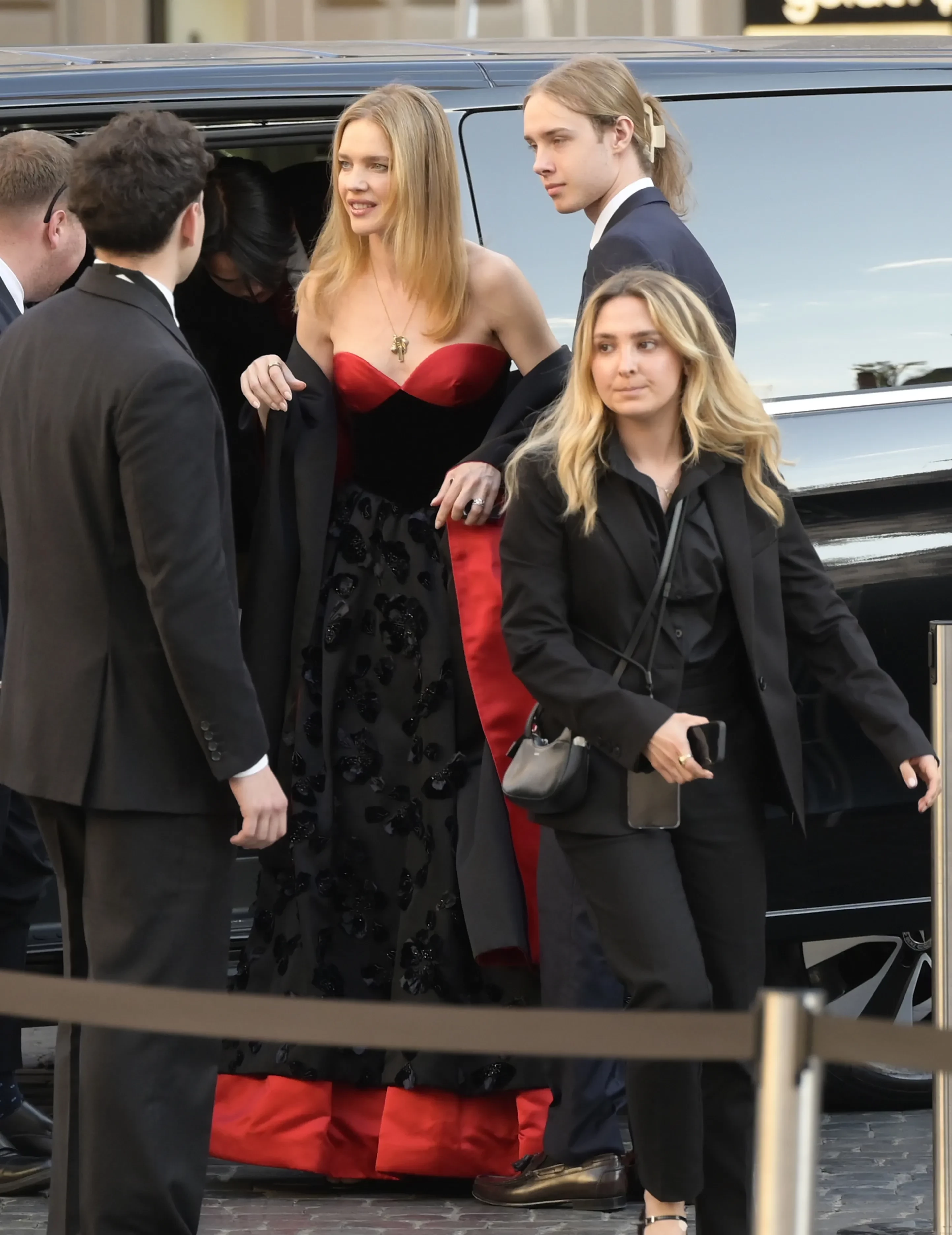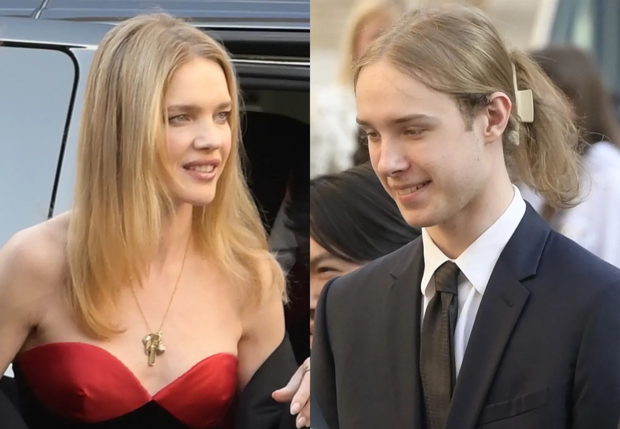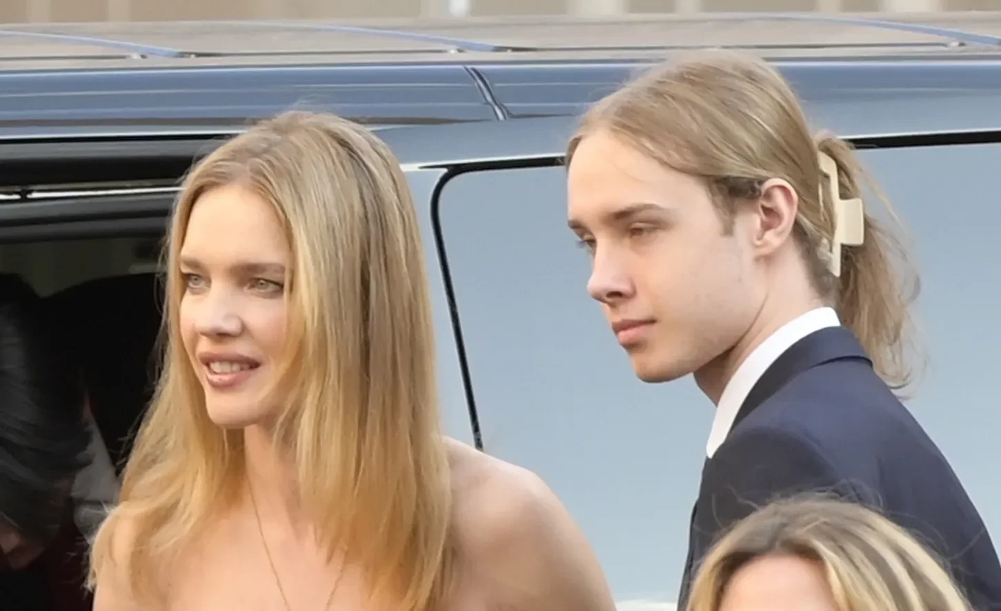 Звезду с сыном засняли во время выхода из машины. Наталья была одета в вечернее платье Valentino, а Лукас — в синий брючный костюм с галстуком. Длинные волосы наследник модели заколол "крабиком".