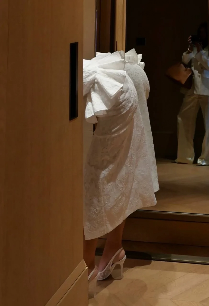 Оксана РимНа роспись Варвара пришла в классическом свадебном платье Giambattista Valli, который она подбирала в ЦУМе. Позже, перед банкетом на крыше “КМ20” невеста сменила наряд на более удобный тотал-лук Jacquemus.