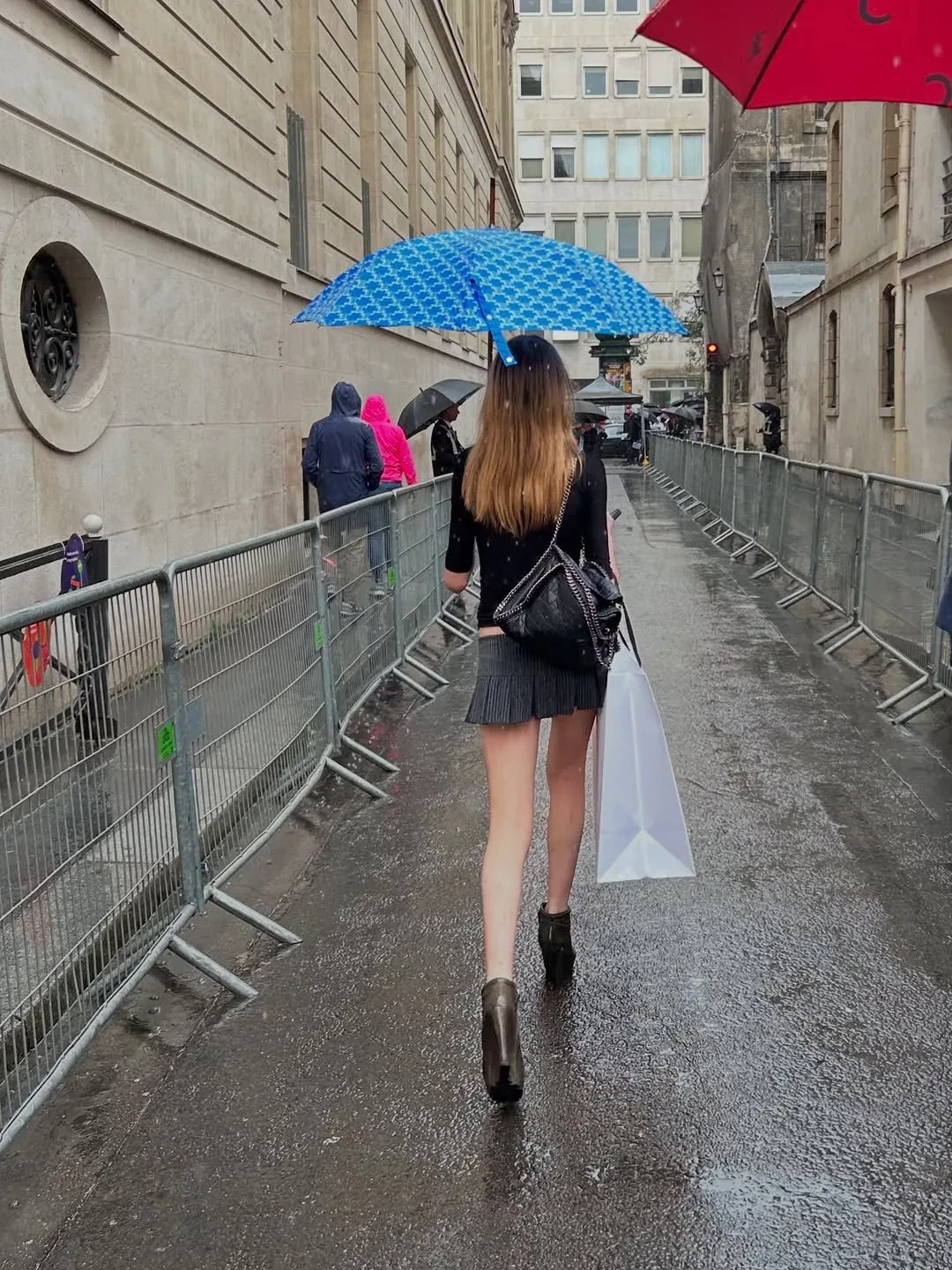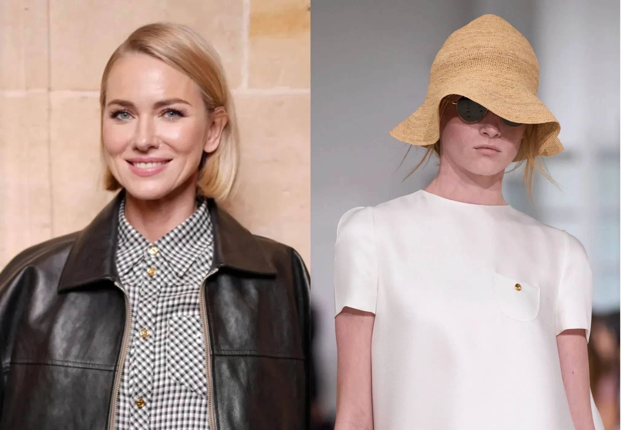 Наоми позировала фотографам в коротком платье в клетку и кожаной куртке и сидела в первом ряду вместе с Кейт Стирлинг, главой агентства IMG Models, в котором состоит Кай. Сын актрисы прошёлся по подиуму в белом платье макси свободного кроя. Образ дополнили соломенная панама, сумка и ювелирные украшения.