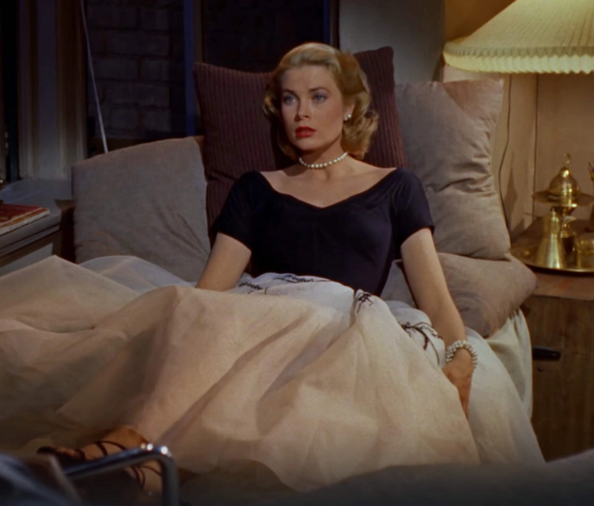 Речь о платье, которое было на Грейс в фильме “Окно во двор” Альфреда Хичкока, где она снималась вместе с Джеймсом Стюартом. Пусть платье Камиллы и не было точной копией оригинала, оно повторяло его основные элементы: чёрный верх с V-образным вырезом, белый низ и уникальную отделку на поясе.