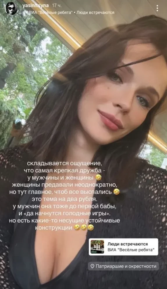 "Складывается ощущение, что самая крепкая дружба — у мужчины и женщины. Женщины предавали неоднократно. У мужчин она тоже до первой бабы, и "да начнутся голодные игры". Но есть какие-то несущие устойчивые конструкции", — написала Синицына в своём инстаграме*.