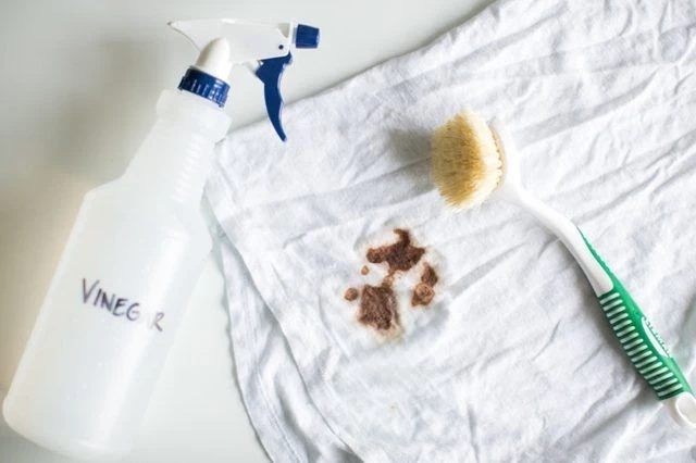 Столовый уксус стоит сущие копейки, а по силе действия на пятна даёт фору дорогим средствам. Смешайте его с водой в равных пропорциях, нанесите на пятно и посыпьте сверху содой — химия сработает сама.
