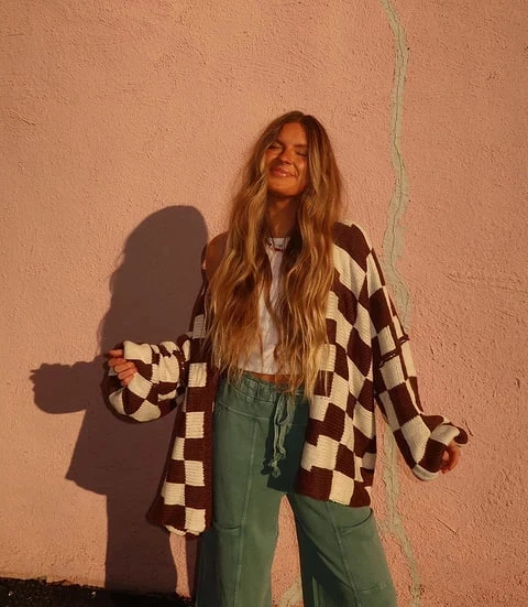 Чёрно-белые комплекты с клеткой — классика, которая не надоедает, особенно если играть с пропорциями и материалами. Серые оттенки с клеткой добавляют образу сдержанности и утончённости, а бежево-коричневые тона с клеткой создают атмосферу теплоты и уюта в стиле олд мани.